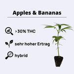 Das Aromaprofil von Apples and Bananas präsentiert sich außergewöhnlich fruchtig und komplex. Dominante Noten von säuerlichen Äpfeln und reifen Birnen verschmelzen mit süßen Bananen-Akzenten zu einem unverwechselbaren Obstkorb-Bouquet. Beim Zerkleinern treten würzige Pfeffer-Nuancen hervor, begleitet von erdigen Kiefern-Tönen und einer subtilen floralen Süße. Der Geschmack beim Inhalieren zeigt sich süß-fruchtig mit ausgeprägten Apfel- und Birnen-Noten, während beim Ausatmen cremige Bananen-Aromen mit einem Hauch schwarzem Pfeffer und erdiger Kiefer dominieren. Die Blüten selbst sind extrem dicht strukturiert und klobig geformt, mit olivgrünen Grundfarben und charakteristischen tiefen Purpur-Tönen, die sich gegen Ende der Blüte intensivieren. Leuchtend orangefarbene Stempel bedecken die Buds, während eine außergewöhnlich dicke Schicht silbriger, kristalliner Trichome den Blüten ein schimmerndes, bereiftes Erscheinungsbild verleiht. Die intensive Harzproduktion macht Apples and Bananas ideal für die Extrakt-Herstellung und sorgt für klebrige Finger beim Handling.