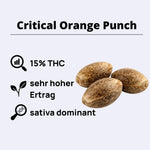 Critical Orange Punch präsentiert sich als wahre Fruchtbombe mit einem faszinierenden Aromaprofil: intensiver Zitrusduft mit Orange, Mandarine und Zitrone als die dominantesten Aromanoten, ergänzt durch tropische Fruchtuntertöne und subtile erdige Noten. Die Blüten entwickeln sich sehr dicht und kompakt mit herrlichen Farbwechseln – tiefe Grüntöne wechseln bei kalteren Temperaturen zu dunklen, purpurnen Akzenten. Die reichhaltige Trichom-Schicht erzeugt ein funkelndes, frostiges Erscheinungsbild. Der Geschmack ist eine Explosion fruchtiger und cremiger Noten mit klaren Zitruselementen.